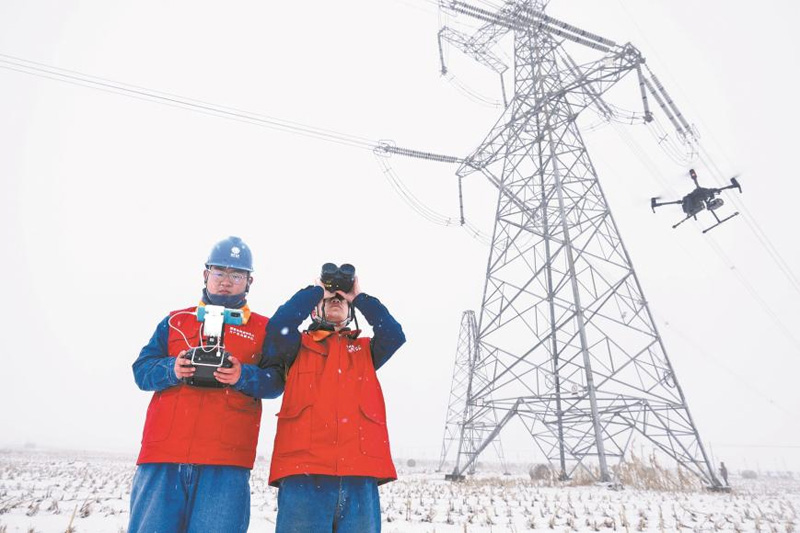 国网吉林超高压公司党员突击队队员运用无人机巡检500千伏永包线覆冰情况。