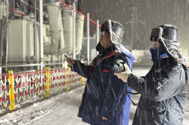 国网黑龙江超高压公司员工冒雪夜巡500千伏黑河换流站,确保电力可靠供应。