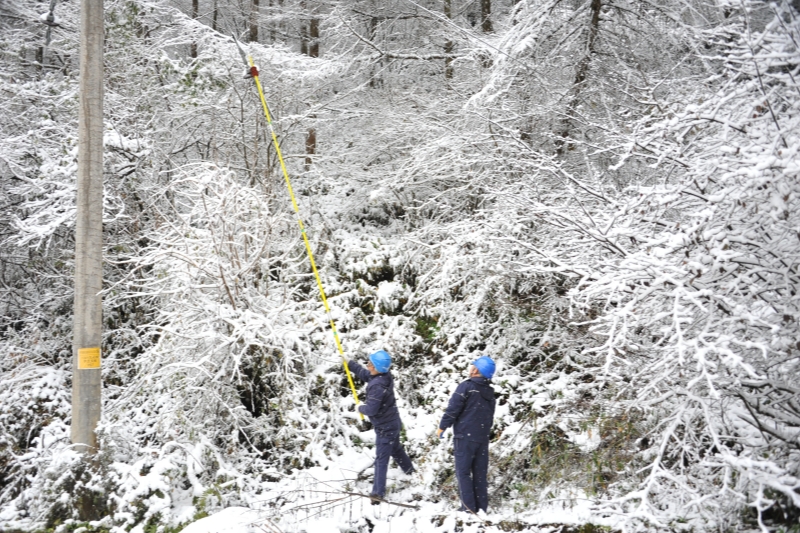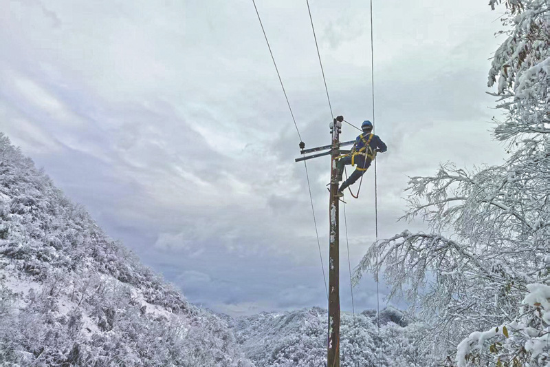 国网陕西电力员工抢修受雨雪影响的供电线路,保障客户安全可靠用电。